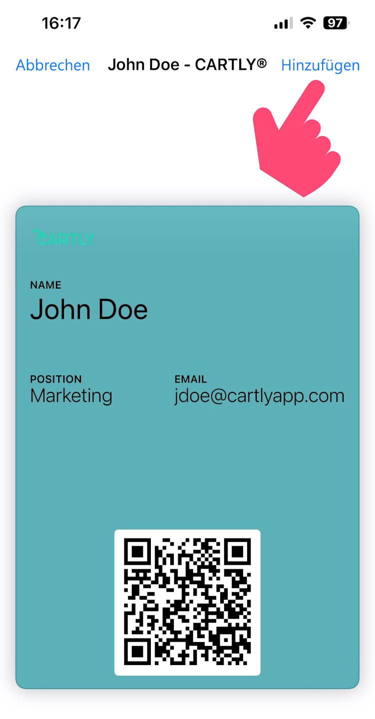 Um Ihre digitale Visitenkarte zu Ihrem Google Wallet hinzuzufügen, rufen Sie auf Ihrem Smartphone den Bereich Wallet Pass auf.