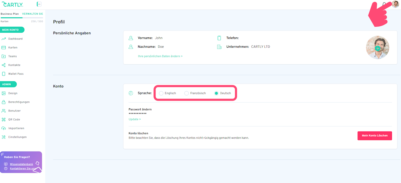 Um die Sprache Ihres Kontos zu ändern, gehen Sie in den Abschnitt Profil, indem Sie oben rechts auf dem Bildschirm unter Ihrem Avatar klicken.