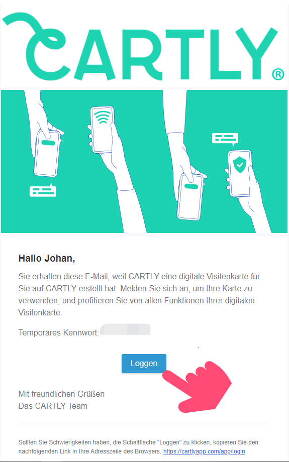 Wenn Sie eine E-Mail-Einladung zur Aktivierung Ihres CARTLY-Kontos erhalten haben, bedeutet dies, dass Ihr Arbeitgeber eine digitale Visitenkarte für Sie erstellt hat.