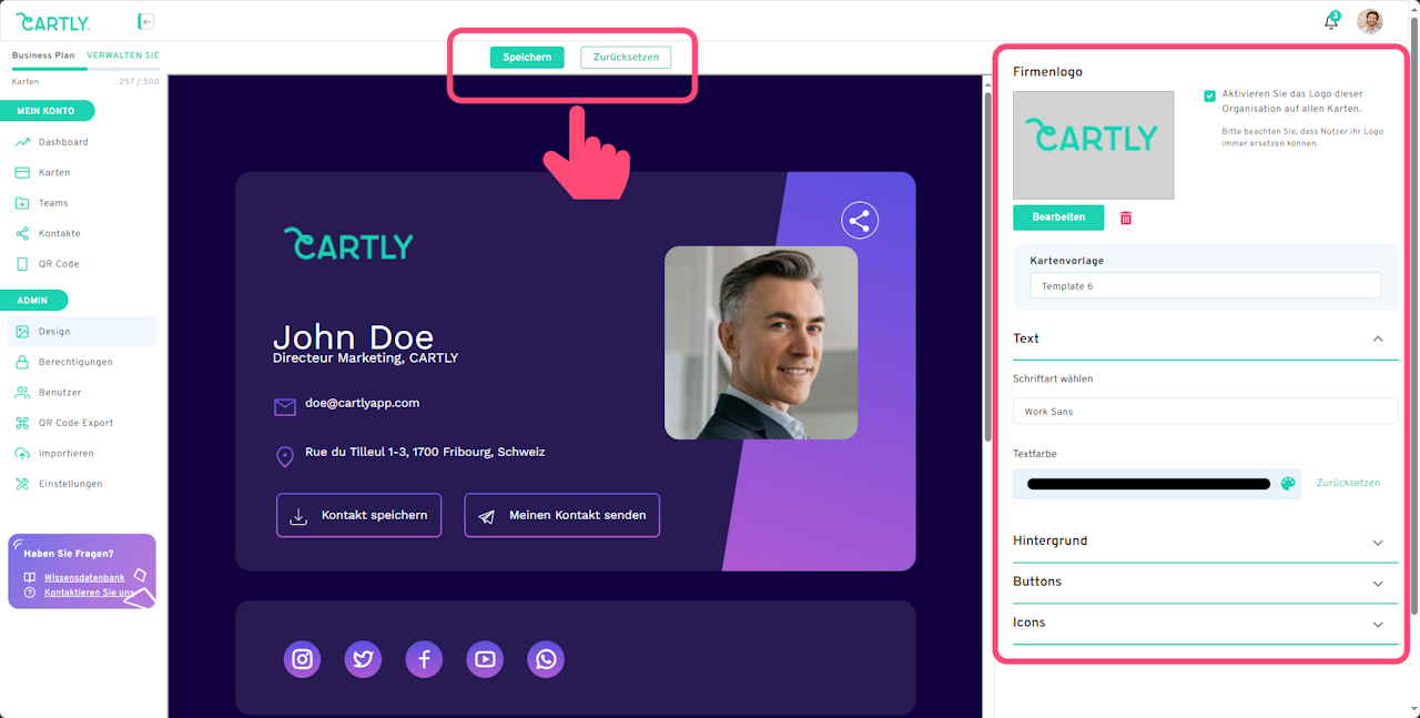 Sie können dann die Designvorlage auswählen, ein Logo hochladen, das Farbschema und die Schriftart anpassen und vieles mehr.