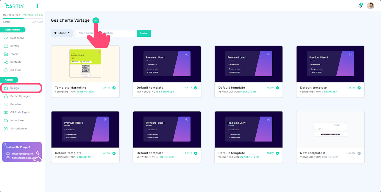 Um eine Designvorlage zu erstellen, gehen Sie in den Bereich Design. Klicken Sie dort auf die Schaltfläche (+), um eine neue Vorlage zu erstellen.