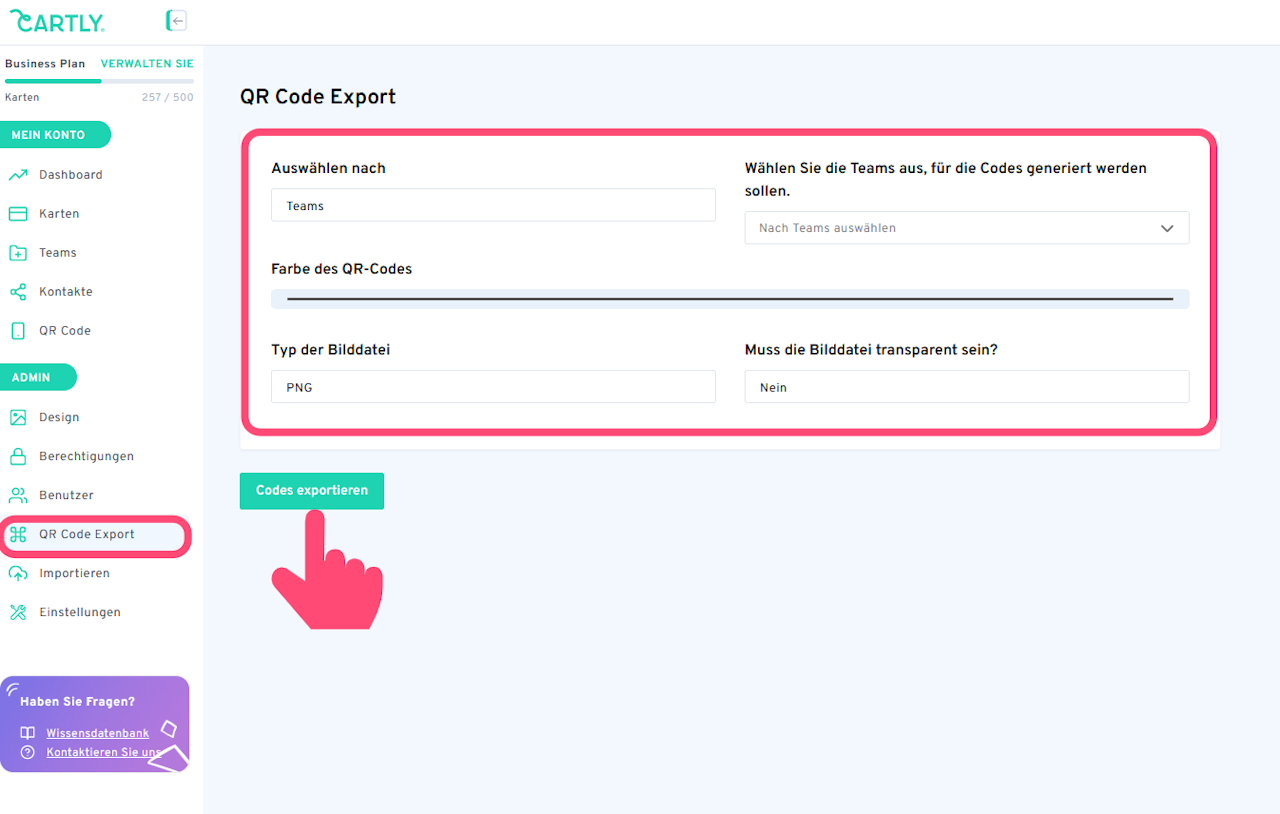 Sie können QR-Codes exportieren, die mit Benutzern oder Teams verknüpft sind, indem Sie zum Abschnitt QR-Code gehen. Von dort aus können Sie auswählen, ob Sie QR-Codes auf der Grundlage folgender Elemente exportieren möchten: