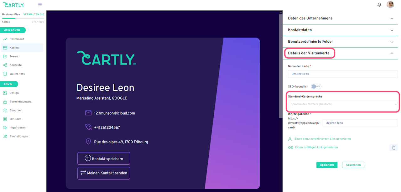 Gehen Sie zum Abschnitt Details der Visitenkarte und wählen Sie Standardsprache der Karte.