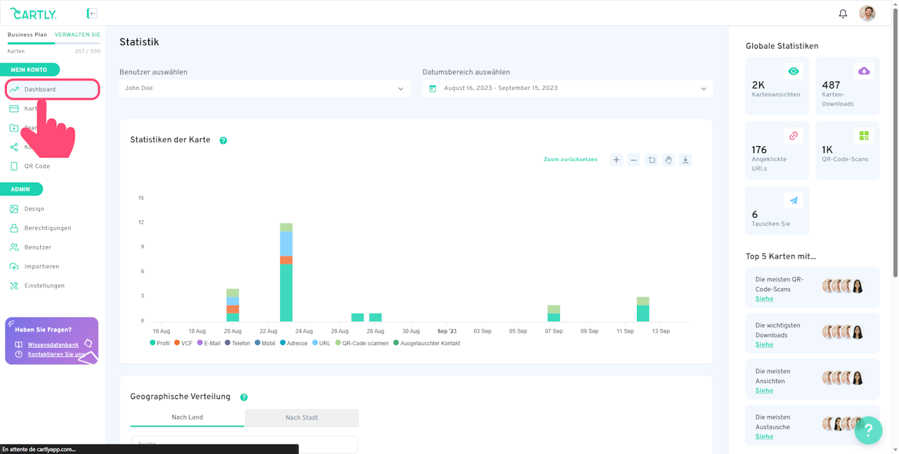 Um die Statistiken Ihrer digitalen Visitenkarte einzusehen, gehen Sie in die linke Spalte des Menüs und klicken Sie auf Statistiken.