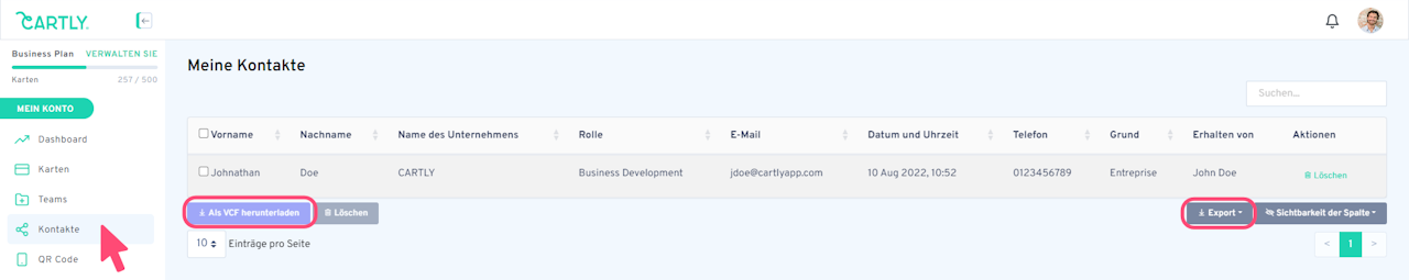 Um die über Ihre digitale Visitenkarte erhaltenen Kontakte zu verwalten, klicken Sie in der linken Spalte des Menüs auf Kontakte.