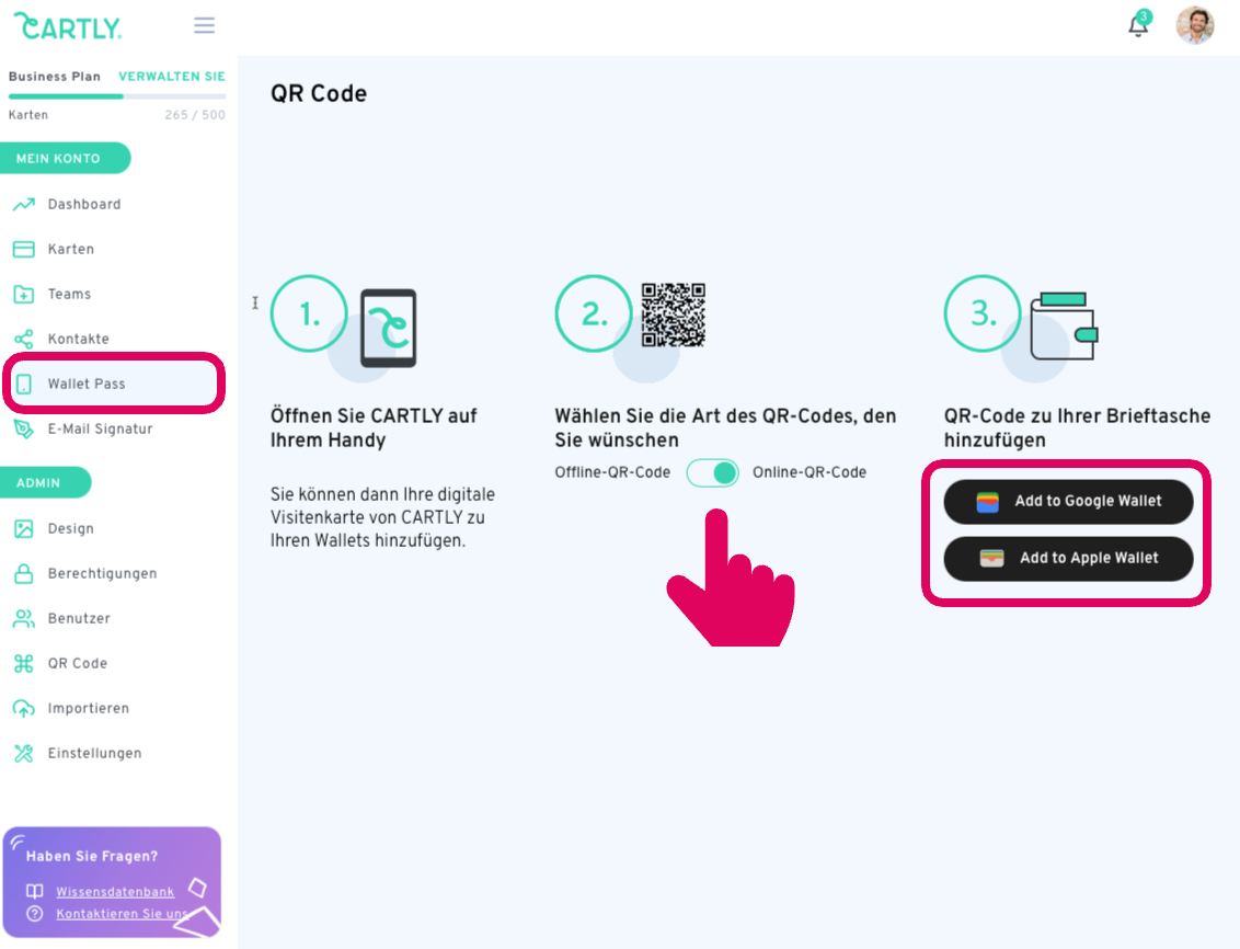 Gehen Sie im Benutzer-Dashboard zum Abschnitt 'Wallet Pass'.
