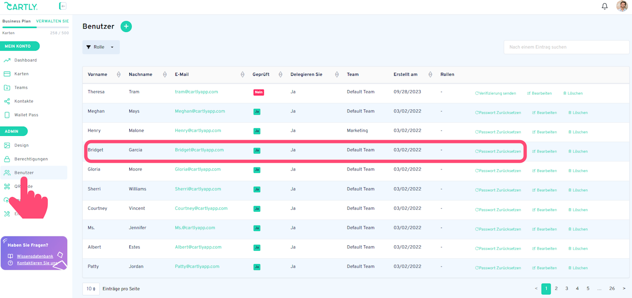 Als Administrator können Sie das Passwort eines Benutzers direkt von Ihrem Konto aus zurücksetzen. Gehen Sie dazu in den Abschnitt Benutzer und suchen Sie den betreffenden Benutzer. Sobald Sie den Benutzer gefunden haben, dessen Passwort zurückgesetzt werden soll, können Sie auf Passwort zurücksetzen klicken. Der Nutzer erhält dann schnell die Anweisungen zum Zurücksetzen seines Passworts.