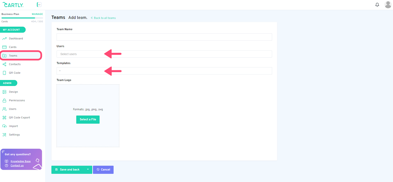 To create a team, go to the Teams section and create a new team by clicking on the button (+). From here, you can enter the relevant details for your team, assign users and allocate a template for use by team users.