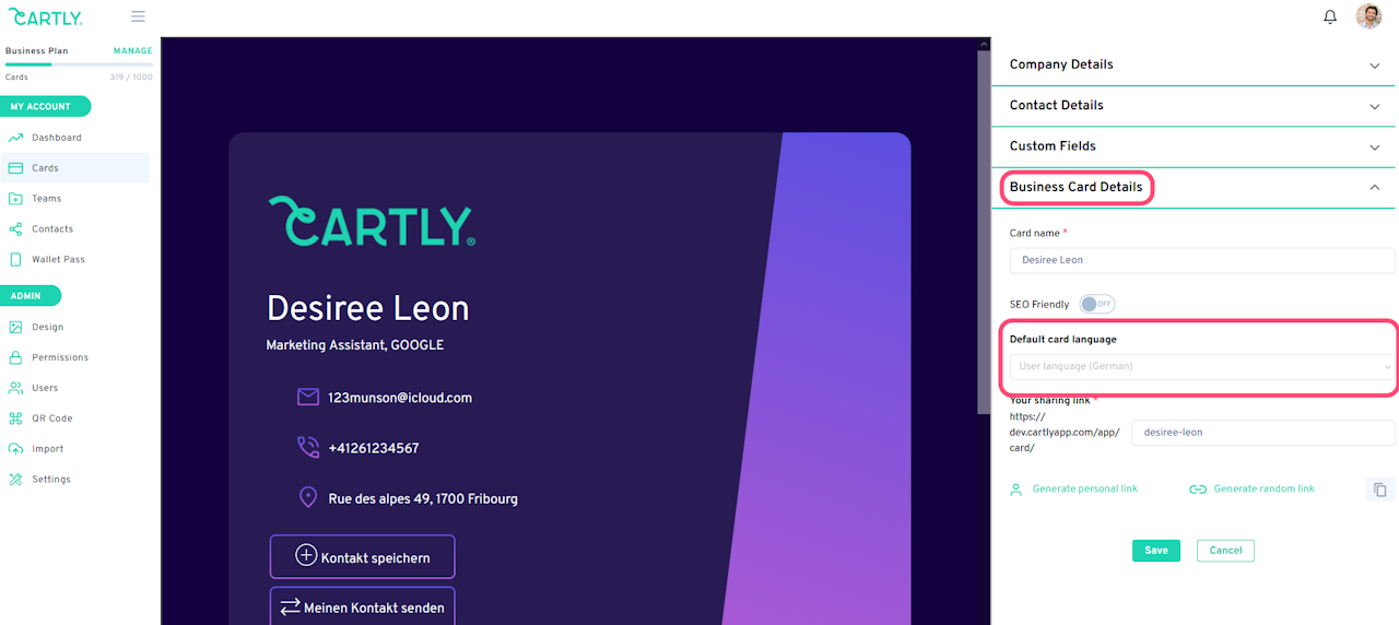 You can choose the default display language for your card to present visitors with a preferred language.