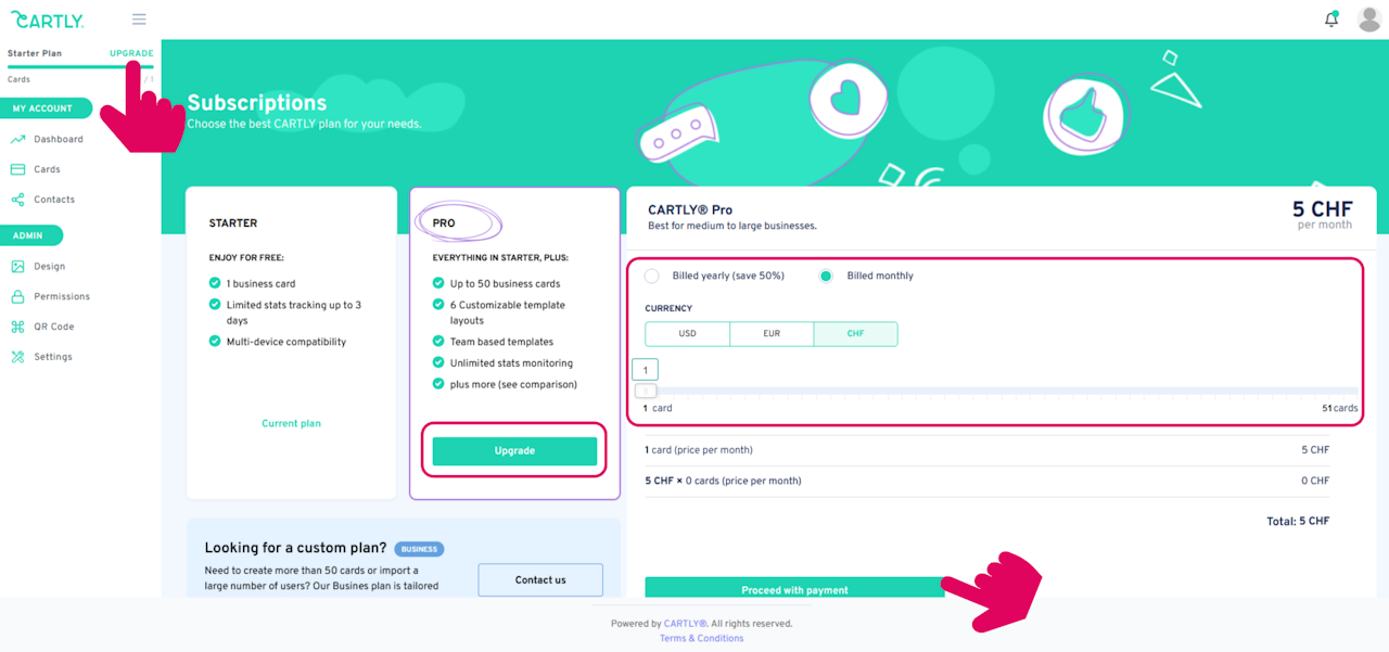 Choose your currency, billing frequency, and the number of cards you wish to add.