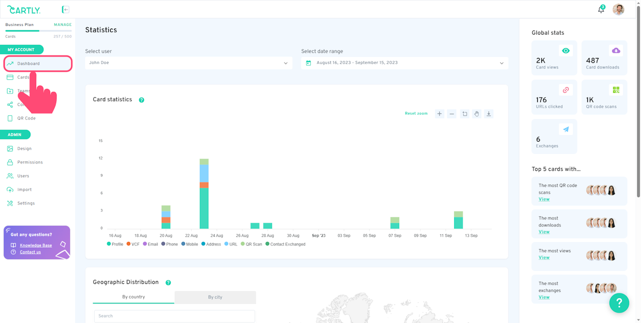 To view the statistics of your digital business card, go to the left column of the menu and click on Statistics.