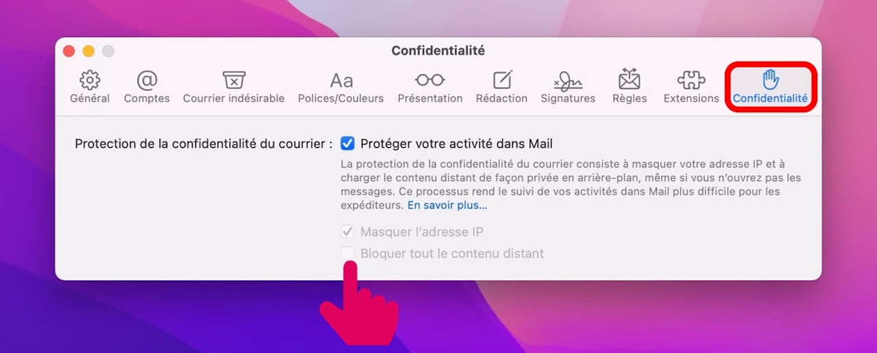 Si les images de votre signature CARTLY (photo, logo, QR code) ne s’affichent pas dans Apple Mail, cela est probablement dû aux paramètres de confidentialité qui bloquent le contenu externe.