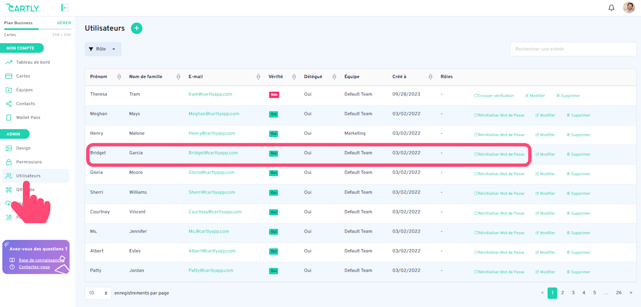 En tant qu'administrateur, vous pouvez réinitialiser le mot de passe d'un utilisateur directement depuis votre compte. Pour ce faire, rendez-vous dans la section des utilisateurs et recherchez l'utilisateur concerné. Une fois que vous avez trouvé l'utilisateur dont le mot de passe doit être réinitialisé, vous pouvez cliquer sur Réinitialiser le mot de passe. L'utilisateur recevra rapidement les instructions de réinitialisation de son mot de passe.