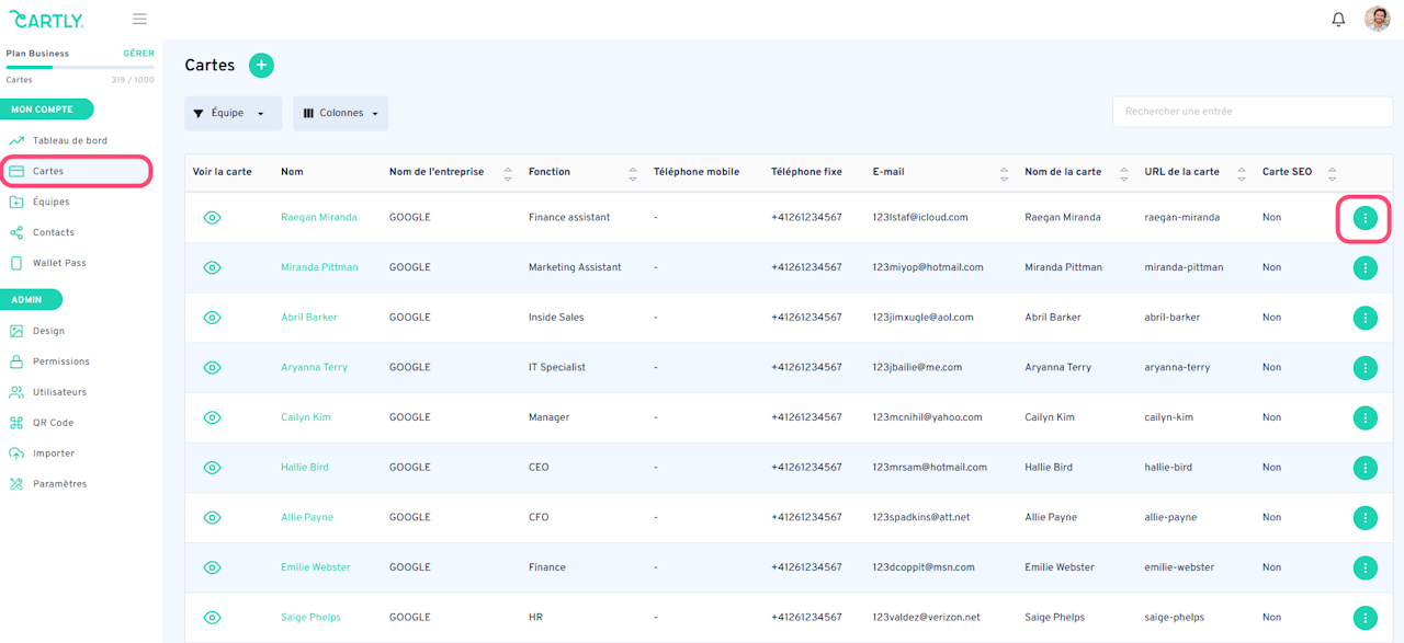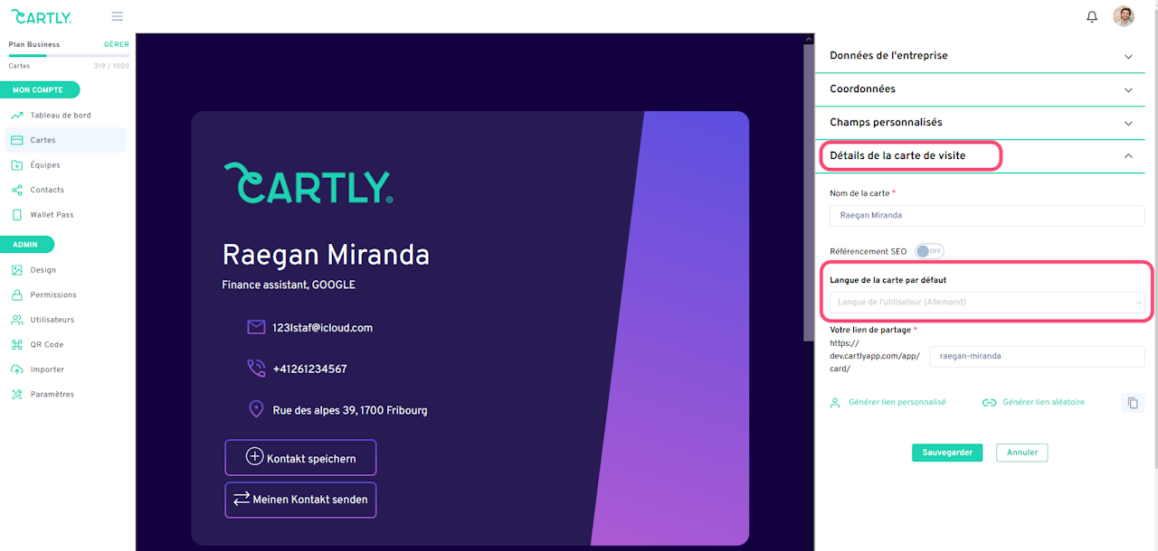 Accédez à la section Détails de la carte de visite, puis sélectionnez Langue par défaut de la carte.