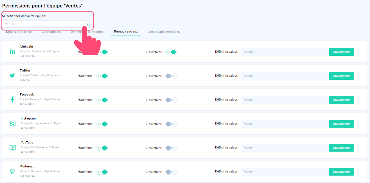 Une fois l'équipe sélectionnée, vous pouvez décider d'autoriser ou non la modification d'un champ spécifique de la carte.